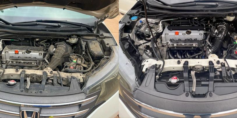 • Degreasing: Utilizing specialized degreasers, we diligently eradicate built-up grime, oil, and dirt from the engine bay, ensuring a pristine surface for detailing.